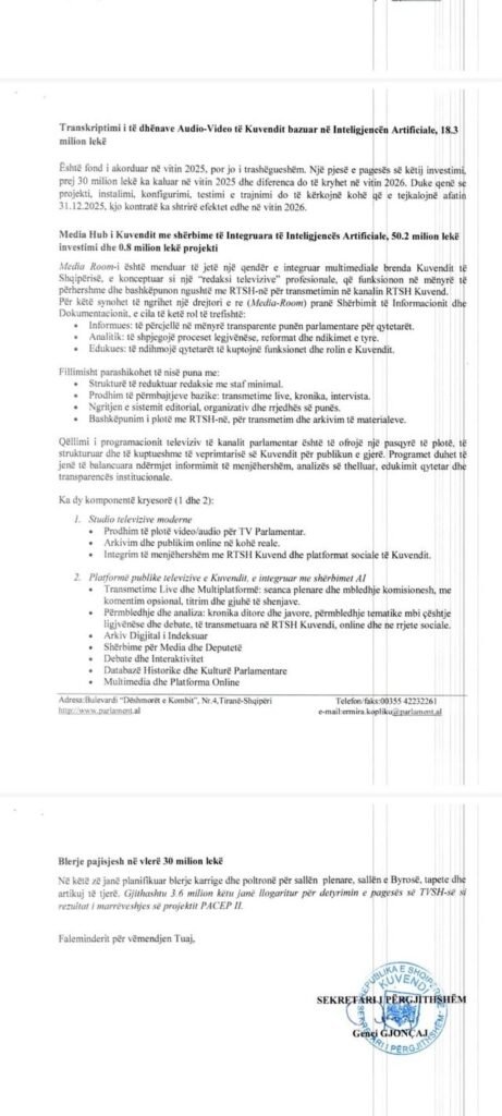 Media Hub i Kuvendit me shërbime të Integruara të Inteligjencës Artificiale, 50.2 milion lekë investimi dhe 0.8 milion lekë projekti.
