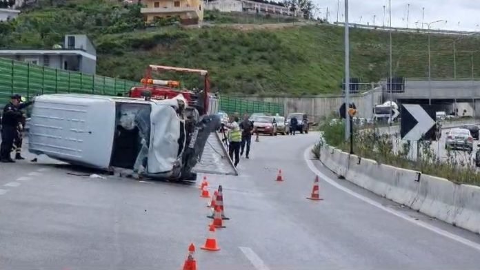 Siç shihet dhe nga pamjet, furgoni është përmbysur, teksa fatmirësisht dy persona kanë shpëtuar vetëm me disa plagë të lehta.