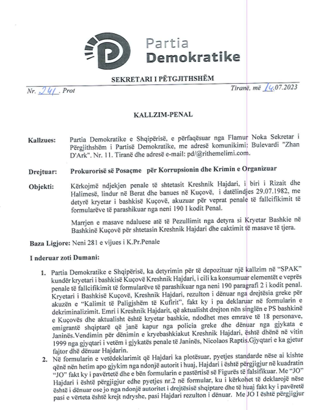 Në kallëzimin që mban datën 14 Korrik, Hajdari akuzohet se ka fshehur në formularin e vetëdeklarimit në dy raste, një dënim nga drejtësia greke. Me anë të një dokumenti zyrtar i përbërë prej 14 pikash, “Bashkë Fitojmë” kërkon pezullimin e Hajdarit si dhe caktimin e masave të tjera të sigurisë për falsifikim të formularëve parashikuar nga neni 190 i Kodit Penal. Për Partinë Demokratike ekzistojnë kushtet ligjore për nisjen e hetimeve ndaj Hajdarit, dhe pezullimin e tij nga detyra si kryetar bashkie.