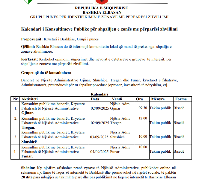 Bashkia Elbasan konsultimi në Gjinar, Shushicë, Tregan dhe Funar e përcaktuara si zona me përparësi zhvillimi. Me anë të publikimit të një njoftimi në faqen zyrtare, kryetari i bashkisë ka ndërmarrë procedurën duke njoftuar edhe takime dhe diskutime me banorët. Kalendarin e gjeni në Kalendari-i-kons-per-zonat-zhvillimore
