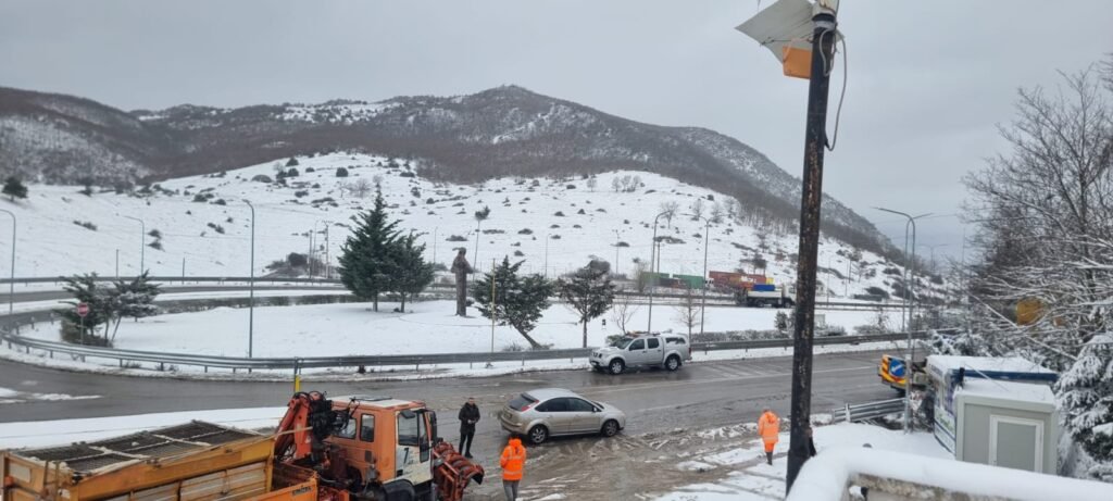 Në pikën e kalimit kufitar të Qafë Thanës, mësohet se është ndaluar qarkullimi i kamionëve për shkak se po punohet me borëpastruese në segmentin hyrës drejt Maqedonisë së Veriut.
