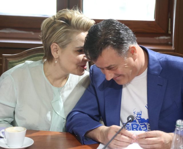 Teksa Altin Dumani po bën raportin vjetor të punës së SPAK, deputetët opozitarë Monika Kryemadhi dhe Flamur Noka shihen teksa pëshpëritin vesh më vesh, e duke qeshur me njeri-tjetrin.