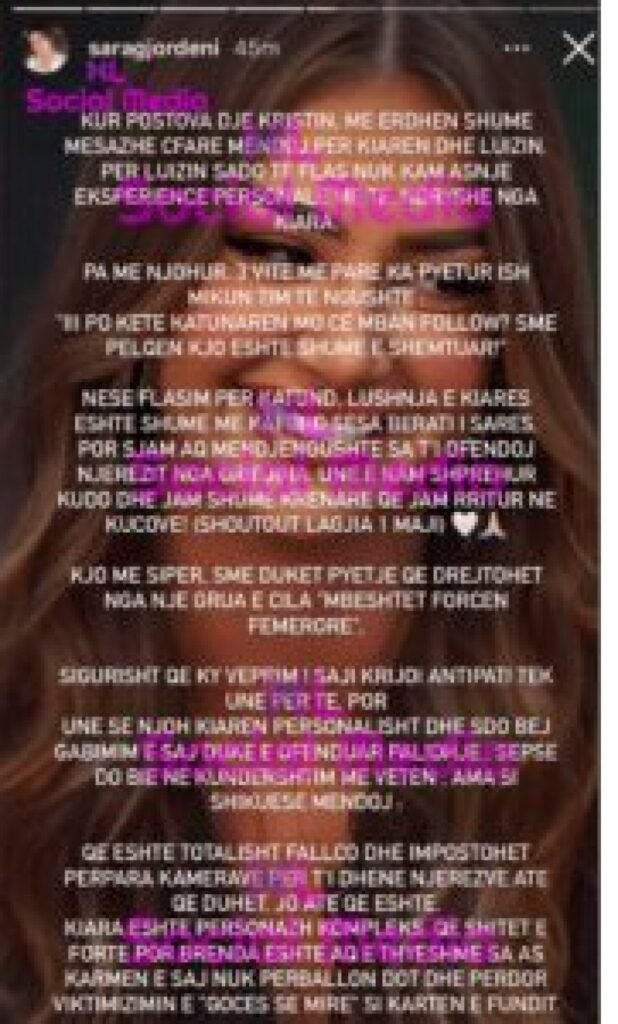 Në postimin në ‘Instastory’ ajo ka treguar një ngjarje të pakëndshme me Kiarën, pasi kjo e fundit i ishte drejtuar një miku të saj për Sarën me fjalët: “Iii po këtë katunaren ç’e mban folloë?