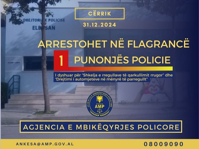 Agjencia e Mbikëqyrjes Policore (Rajoni Elbasan-Korçë) ka arrestuar në flagrancë punonjësin e policisë Inspektor H. B., 57 vjeç, me detyrë Trupë shërbimi në Komisariatin e Policisë Cërrik, i dyshuar për veprat penale “Shkelja e rregullave të qarkullimit rrugor” dhe “Drejtimi i automjeteve në mënyrë të parregullt”.