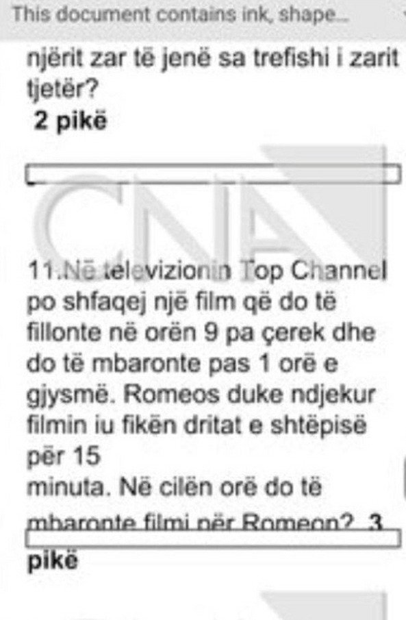 - Në televizionin Top Channel po shfaqej një film që do të fillonte në orën 9 pa çerek dhe do të mbaronte pas 1 orë e gjysmë. Romeos duke ndjekur filmin iu fikën dritat e shtëpisë për 15 a. 10 pa çerek b. 10 e çerek c. 10 e gjysmë d. 9 e gjysmë e. 11 pa çerek minuta. Në cilën orë do të mbaronte filmi për Romeon?,”-shkruhet në pyetje.