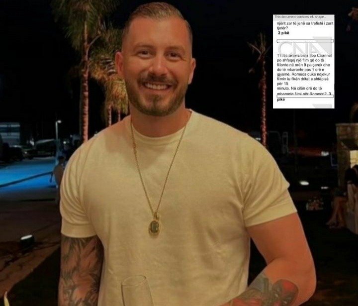 - Në televizionin Top Channel po shfaqej një film që do të fillonte në orën 9 pa çerek dhe do të mbaronte pas 1 orë e gjysmë. Romeos duke ndjekur filmin iu fikën dritat e shtëpisë për 15 a. 10 pa çerek b. 10 e çerek c. 10 e gjysmë d. 9 e gjysmë e. 11 pa çerek minuta. Në cilën orë do të mbaronte filmi për Romeon?,”-shkruhet në pyetje.