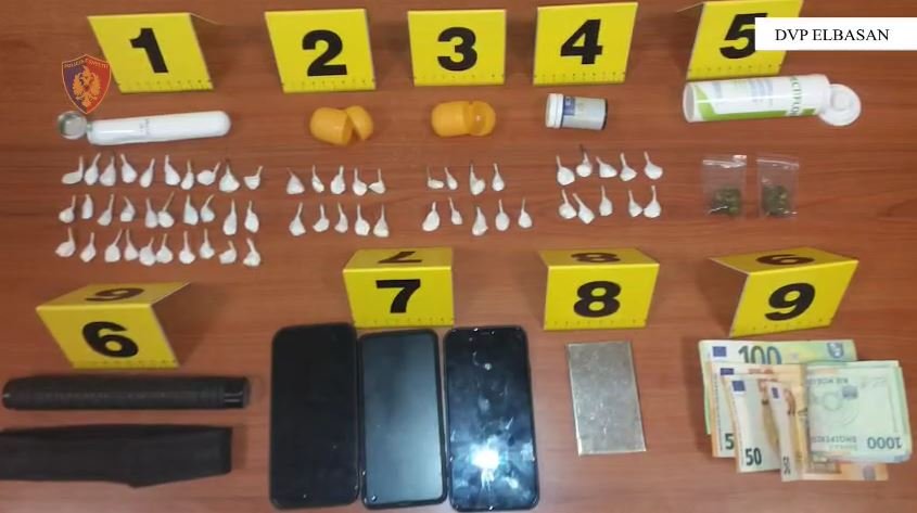Sekuestrohen kokainë, kanabis, automjeti që dyshohet se përdorej për të mundësuar aktivitetin e paligjshëm, aparate celularë, një shkop metalik dhe një shumë parash.