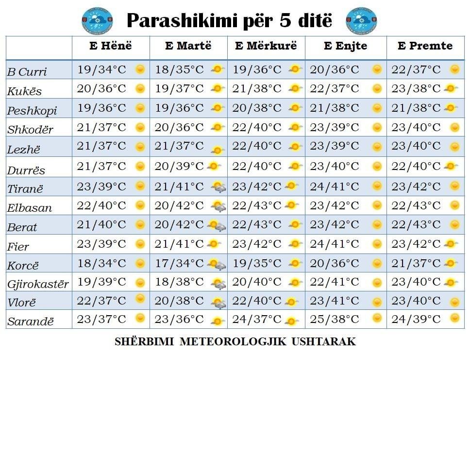 Përjashtim bën dita Martë ku moti pritet të jetë fillimisht i kthjellët e me vranësira në shtim nga orët e mesditës e pasdite kryesisht në jug të territorit. Vranësirat priten të shoqërohen me reshje shiu me intensitet të ulët (pika) e lokal në qendër ndërsa në juglindje kryesisht në relievet malore reshje shiu me intensitet të ulët e lokalisht mesatar në formën e shtrëngatave afatshkurtra shoqëruar hera-herës me shkarkesa elektrike e lokalisht breshër.