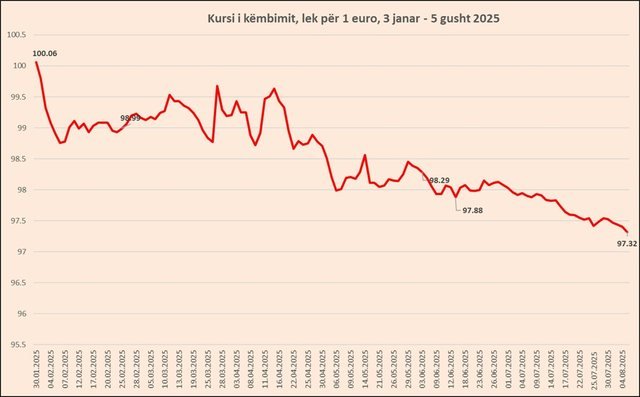 TIRANA- Kursi i këmbimit të Euros po vijon rënien në ditët e para të muajit gusht dhe ka prekur rekorde të reja historike. Sipas kursit zyrtar të këmbimit të Bankës së Shqipërisë, monedha europiane u këmbye sot me 97.3 lekë, niveli më i ulët i regjistruar ndonjëherë.