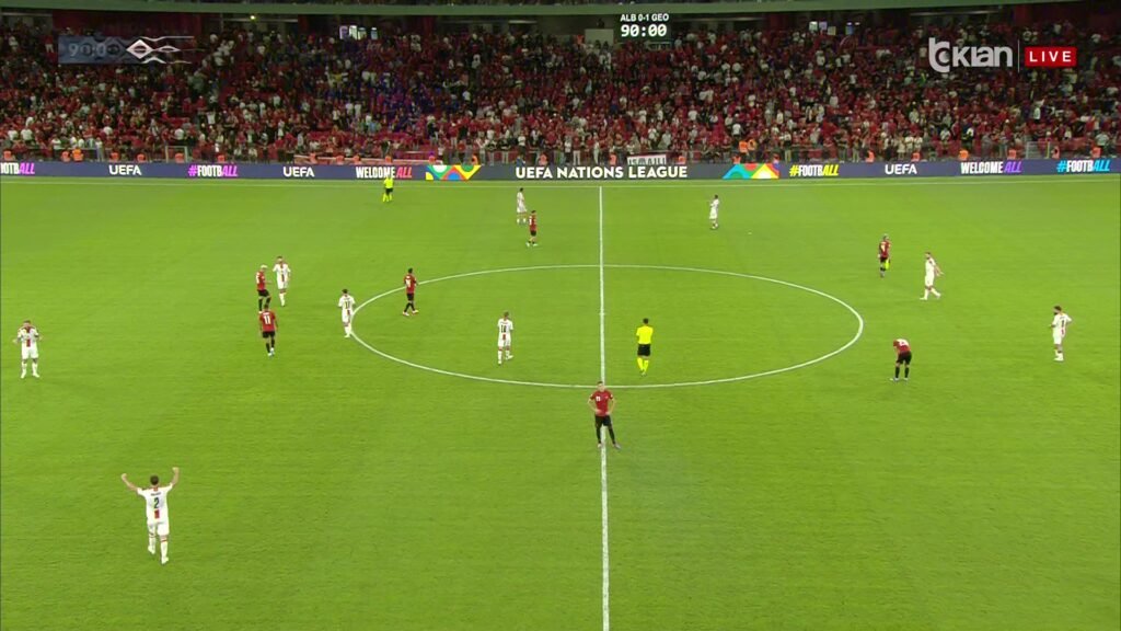 23’- Presion i lartë i Shqipërisë, që bën presing të madh, për të rrëmbyer topin afër zonës së gjeorgjianëve.