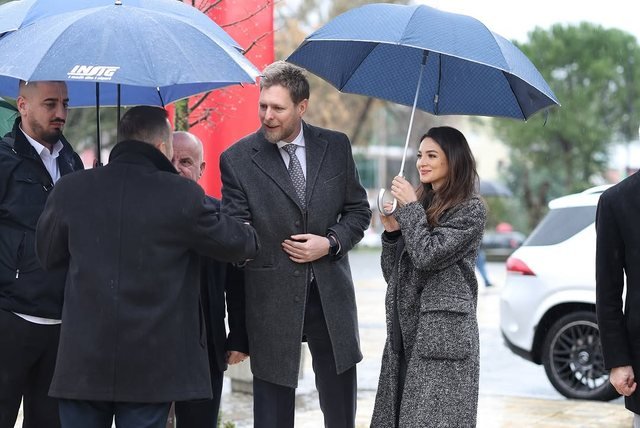Në një nga fotot e publikuara nga vetë Leka, fotografja shihet teksa e shoqëron partnerin e saj në takimet me qytetarë e pjesëmarrës në këtë event, duke i mbajtur çadrën për shkak të reshjeve të shiut.