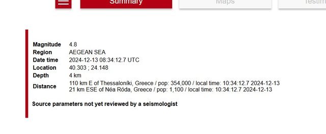 Sipas Qendrës Sizmologjike Euro Mesdhetare epiqendra e tërmetit u regjistrua në veri të vendit, në afërsi të malit Athos. Ndërsa thellësia e tërmetit vlerësohet se ishte 4 kilometra.