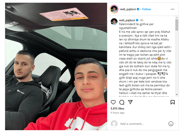 “Faleminderit të gjithëvë për ngushëllimet! E nis me çdo sprovë që vjen prej Allahut e pranojm.. Ikja e ildit vllait tim na ka lënë nji dhimbje shumë të madhe Allahu na i lehtësoftë këto sprova në këtë jetë kalimtare. Kur shikoj lart nga qielli ësht i pafund ashtu si dashuria ime për ty vllai im të tregoj për kohën që esht plot rreze dielli sic shpirti jot ishte do vi çdo dit do të takoj do të ndaj me ty çdo gjë nuk do lodhem kurr duke fol me ty dhe pse ti nuk do më përgjigjesh më engjelli me i bukur i parajsës.