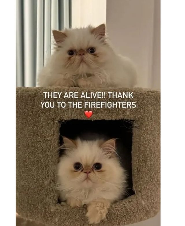 “Ato janë gjallë!!” ka shkruar ajo në një tjetër foto të dy maceve. “Faleminderit zjarrfikësve.”