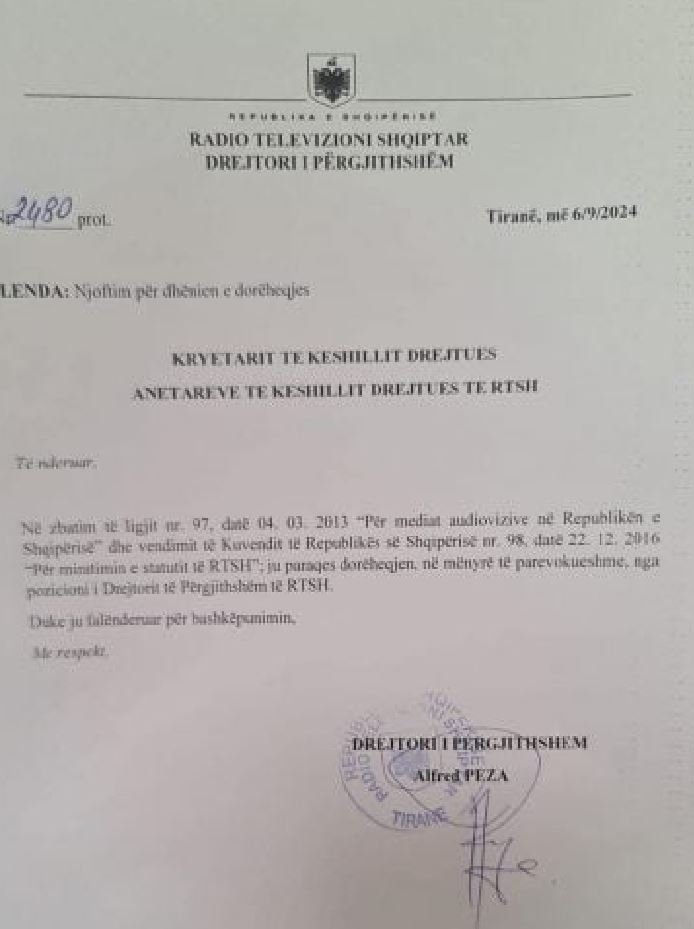 Jep dorëheqjen nga posti i Drejtorit të Radio Televizionit Publik Shqiptar Alfred Peza