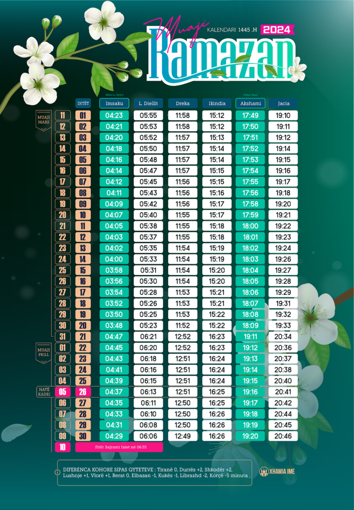 Dita e parë e Ramazanit është me 11 mars, ku koha e syfyrit është në ora 04:23, ndërsa iftari në orën 17:49. Dita e fundit e Ramazanit është më 9 prill, ndërkaq Fitër Bajrami festohet më 10 prill.