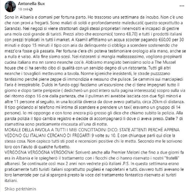 Një përdoruese e rrjeteve sociale, nën emrin Antonella Bux, ka treguar se qëndrimi në Shqipëri për të ishte makth.