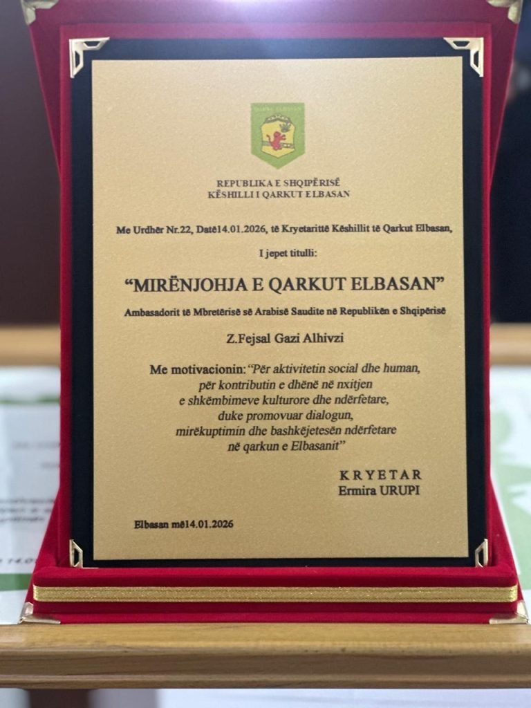 Këshilli i Qarkut Elbasan organizoi sot një ceremoni zyrtare për të nderuar Ambasadorin e Mbretërisë së Arabisë Saudite në Republikën e Shqipërisë, z. Faisal Ghazi Al-Hafthi, duke i akorduar Certifikatë Mirënjohjeje, në bazë të vendimit nr. 22, datë 14 janar 2026.