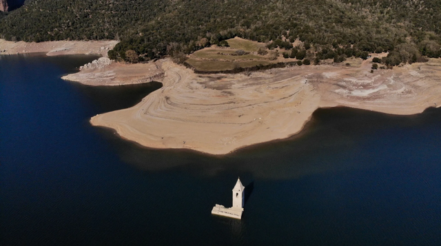 Një pamje ajrore e kishës pjesërisht të zhytur të Sant Romà-s, e dukshme për shkak të nivelit të ulët të ujit në rezervuarin Sau në Katalonjë