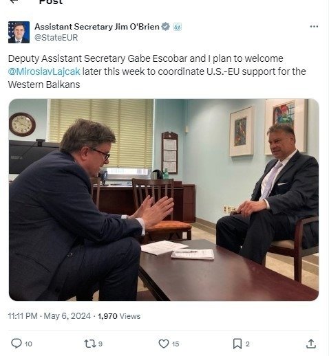 Zëvendës Ndihmës Sekretari Gabe Escobar dhe unë planifikojmë të mirëpresim @MiroslavLajcak në fund të kësaj jave për të koordinuar mbështetjen SHBA-BE për Ballkanin Perëndimor.