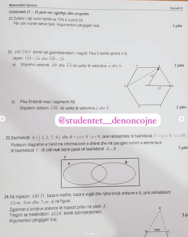 Është publikuar disa minuta pasi maturantët kanë nisur testimin, teza e provimit të Matematikës.