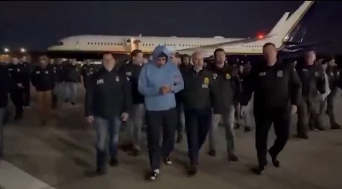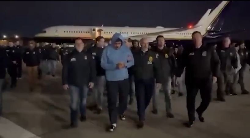 Në foto ai shihet me pranga në duar, të vendosura përpara, ndërsa në një prej imazheve pozon duke bërë shenjën e “gishtit lart”. Në një tjetër pamje, ai duket duke qëndruar jashtë avionit, pak pas uljes në Nju Jork.