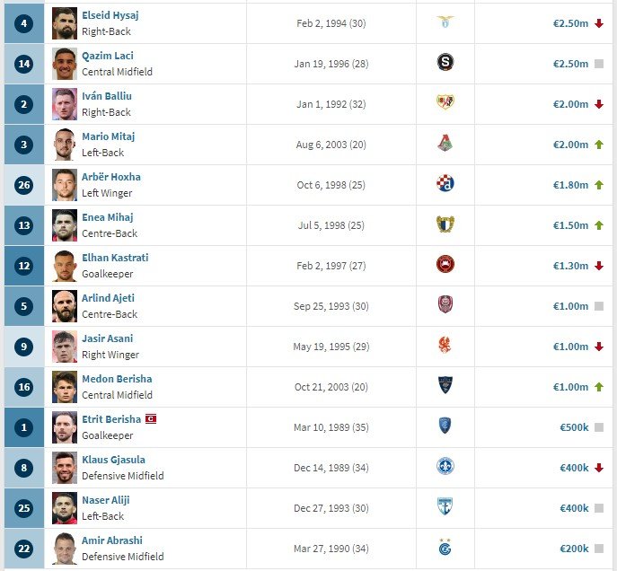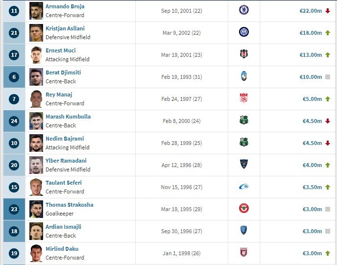 Sipas faqes së specializuar të statistikave dhe transferimeve, Transfermarkt, vetëm katër lojtarë kanë vlerë 10 milionë euro e sipër te Shqipëria. Lojtari më i shtrenjtë në listë është padyshim sulmuesi në pronësi të Chelseat, Armando Broja, që aktualisht vlerësohet 22 milionë euro.