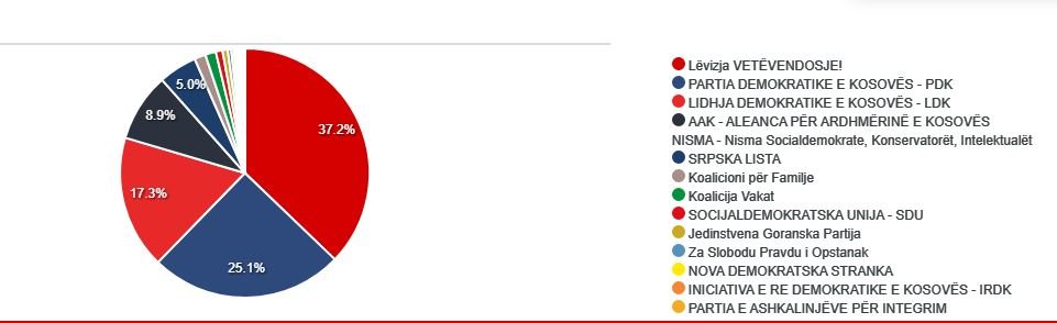 Kështu, në këto pak vendvotime të numëruara, Lëvizja Vetëvendosje kryeson me 37.18% e ndjekur nga PDK me 25.10%, LDK me 17.28% dhe AAK me 8.86%.