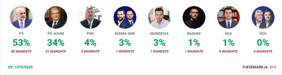 KryesorePolitikëNumërohen mbi 1500 kuti, PS thellon diferencën me PD, forcë e tretë PSD 12 Maj, 2025FacebookTwitterPinterestWhatsApp Janë numëruar 1527 kuti nga 5225 në total. PS kryeson me 52.85 % (203046 vota). Ndiqet nga PD me 34.27 % (131662 vota).Forcë e tretë renditet PSD me 3.69 % (14165 vota), ndjekur nga Nisma Shqipëria Bëhet me 3.47 % (13318 vota).