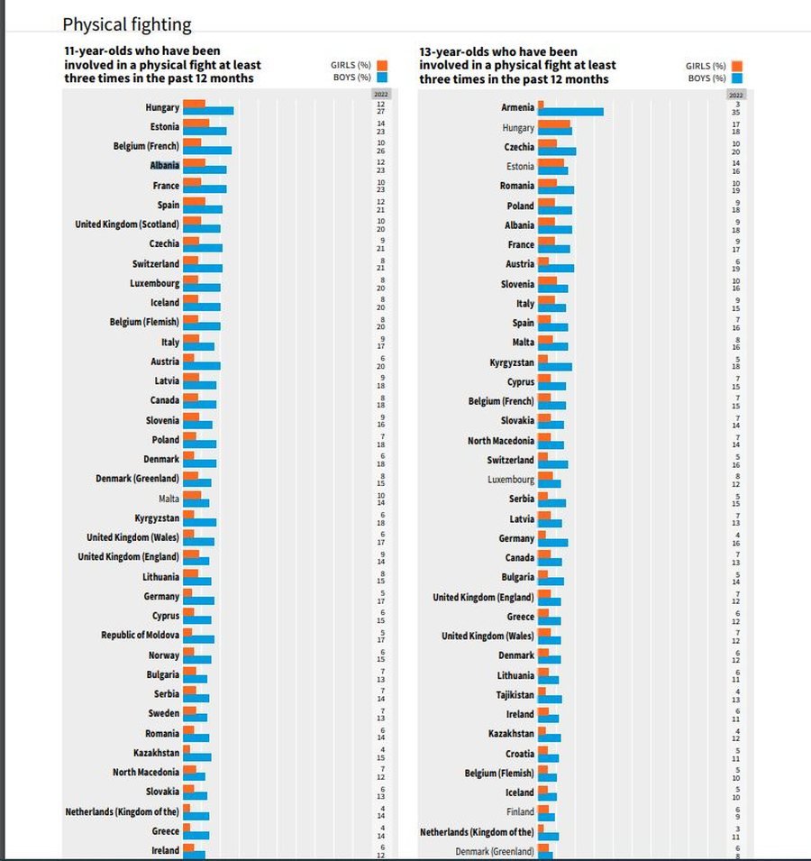 Sipas raportit të Organizatës Botërore të Shëndetësisë, Shqipëria renditet në vendin e katërt sa i përket përplasjeve mes adoleshentëve që nisin nga rrjetet sociale. Raporti vëren se 1 në 10 adoleshentë raportoi se ishte përfshirë në përleshje fizike të paktën tre herë në 12 muajt e fundit (14% e djemve dhe 6% e vajzave). Anketa është zhvilluar për vitet 2021-2022.