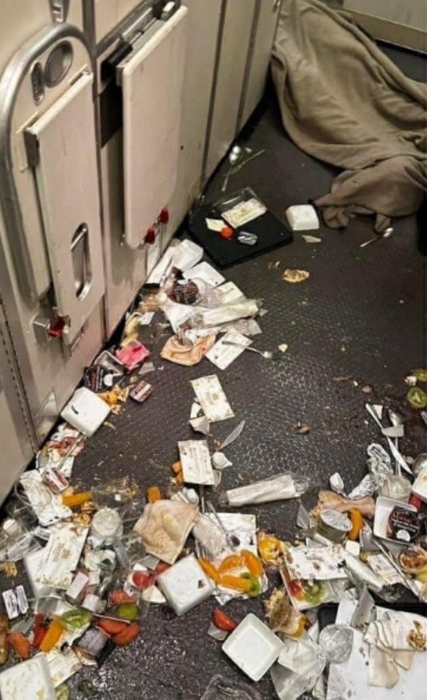 Siç duket edhe nga pamjet turbulencat e forta kanë hedhur përtokë ushqimet dhe sendet personale të pasagjerëve.