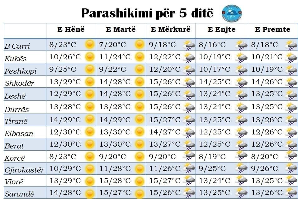 Në këtë mënyrë për ditën e Hënë dhe atë të Martë moti parashikohet i kthjellët në të gjithë territorin si dhe temperatura disa gradë më të larta për periudhën që ndodhemi.