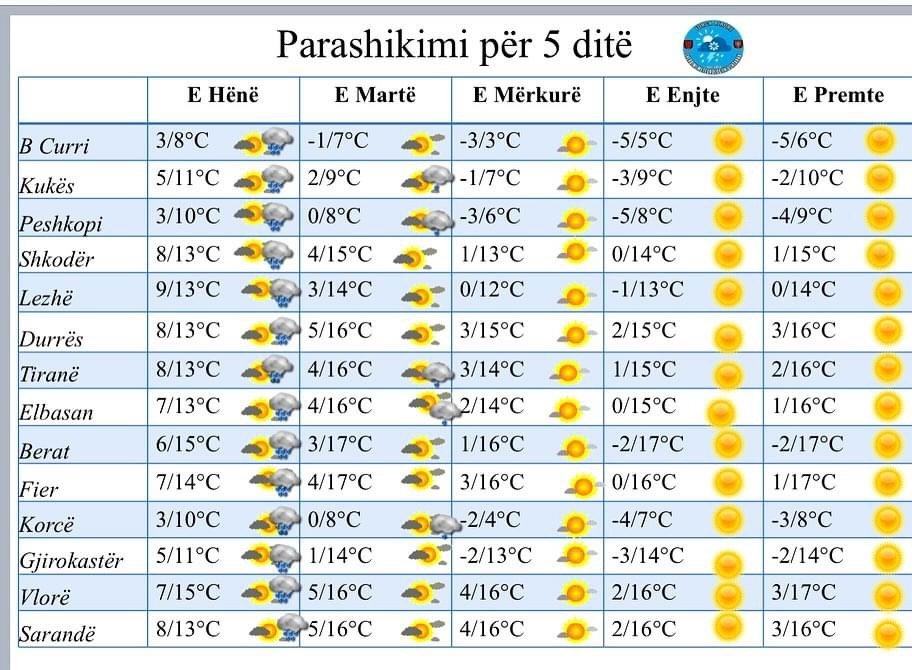 Ditën e Mërkurë, të Ejnte dhe të Premte moti parashikohet i qëndrueshëm me mbizotërim të motit të kthjellët, ndërsa vranësirat do të jenë të pakta dhe kalimtare.