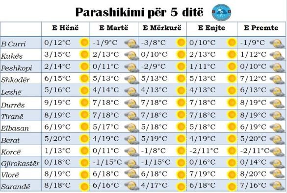 Vlen për tu theksuar se për shkak të masave ajrore më të ngrohta dhe orëve me diell temperaturat në orët e mesditës do të jenë disa grad më të larta se ato të zakonshme për periudhën që ndodhemi.