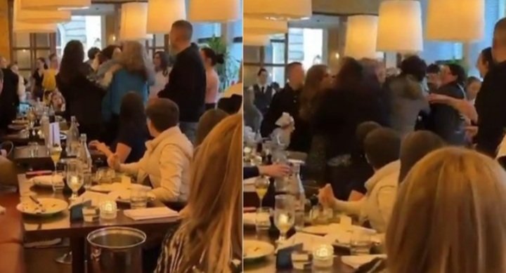 Një nënë e tmerruar mund të shihej duke mbrojtur kokën e vajzës së saj, teksa sherri shpërtheu në restorantin e bukur.