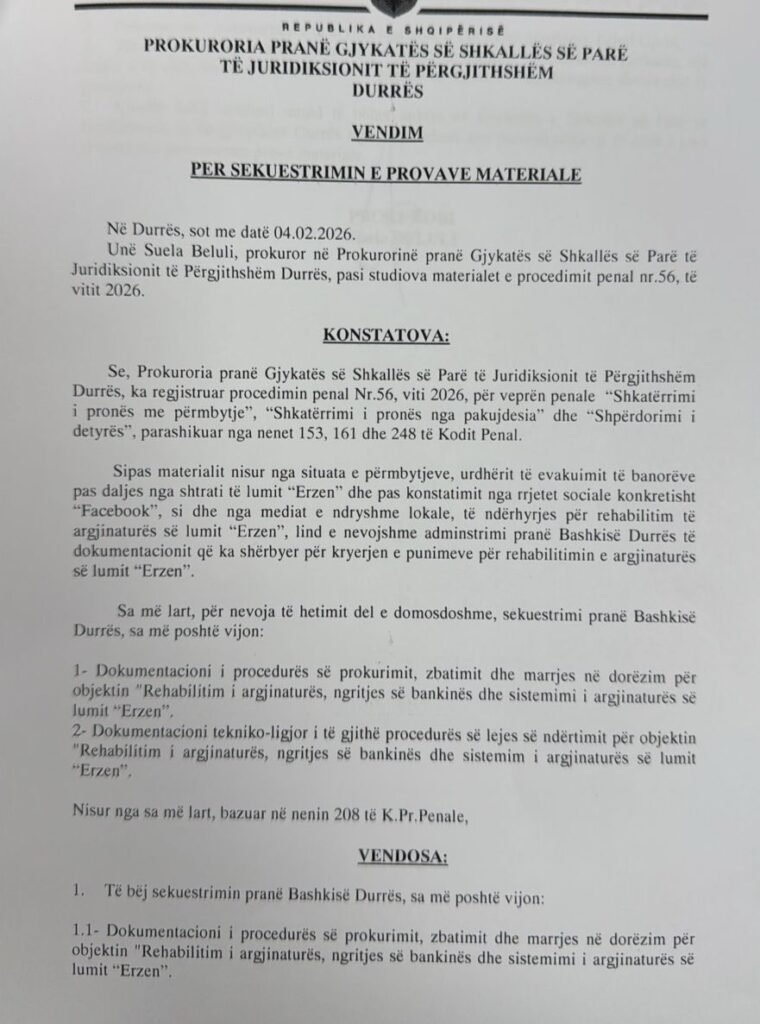 Në bazë të vendimit të datës 4 shkurt 2026, prokurorja Beluli ka urdhëruar sekuestrimin e të gjithë dokumentacionit në Bashkinë Durrës, që lidhet me procedurat e prokurimit, zbatimin dhe dorëzimin e punimeve për rehabilitimin e argjinaturës, ngritjen e bankinës dhe sistemimin e lumit Erzen. Po ashtu, është kërkuar edhe dokumentacioni tekniko-ligjor i lejes së ndërtimit për këtë objekt.