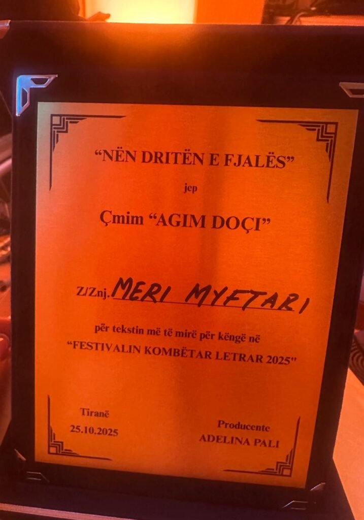 Poetja dhe autorja Meri Myftari është vlerësuar me Çmimin “Agim Doçi” për tekstin më të mirë për këngë, në kuadër të Festivalit Kombëtar Letrar 2025, i cili u zhvillua mbrëmë në Tiranë.