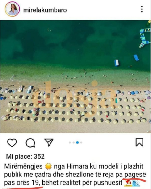 “Mirëmëngjes nga Himara, ku modeli i plazhit publik me çadra dhe shezllone të reja pa pagesë pas orës 19, bëhet realitet për pushuesit,”- shkruante Kumbaro paraditen e 15 korrikut me anë të një postimi në Instagram.