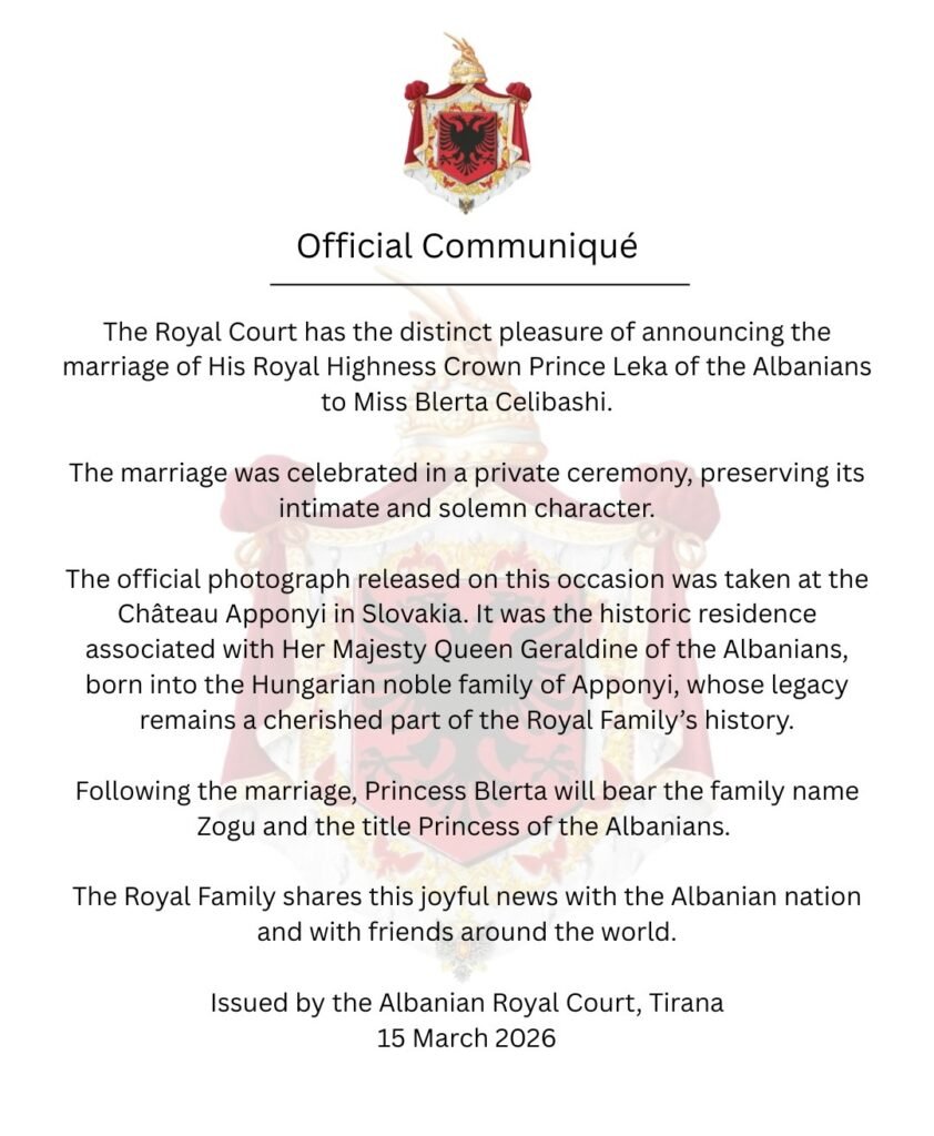 Tiranë, 15 mars 2026 – Oborri Mbretëror Shqiptar ka njoftuar zyrtarisht martesën e Leka II Zogu, Princ i Shqiptarëve, me Blerta Celibashin.