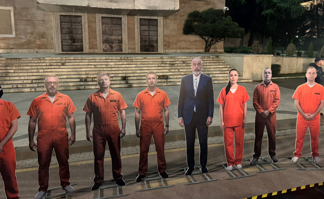 Figurat e improvizuara të funksionarëve të lartë të PD shihen të veshur me uniformat e burgut krah asaj të Ramës dhe Belinda Ballukut.