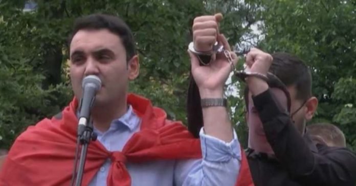 Gjatë fjalës së tij në protestën para Bashkisë Tiranë, Belind Këlliçi i ka vënë prangat një personi i cili mbante një maskë në fytyrë me pamjen e kryebashkiakut Erjon veliaj.