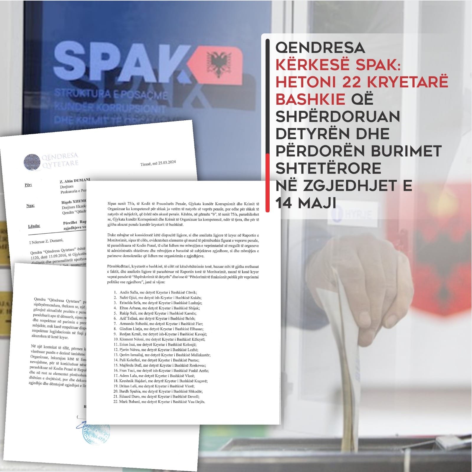 IRANË– Qëndresa Qytetare depozitoi sot ne Prokurorinë e Posaçme SPAK kërkesën për verifikimin dhe hetimin e shkeljeve të konsumuara nga 22 kryetarë bashkish në zgjedhjet e 14 majit, nëpërmjet perdorimit të aseteve publike dhe mospermbushjes se detyrimeve ligjore të parashikuara ne Kodin Zgjedhor. Nder 22 kryebashkiaket jane edhe Gledian Llatja, Andis Salla dhe Arif Tafani per shkelje gjate procesit te zgjedhjeve vendore te nje viti me pare.