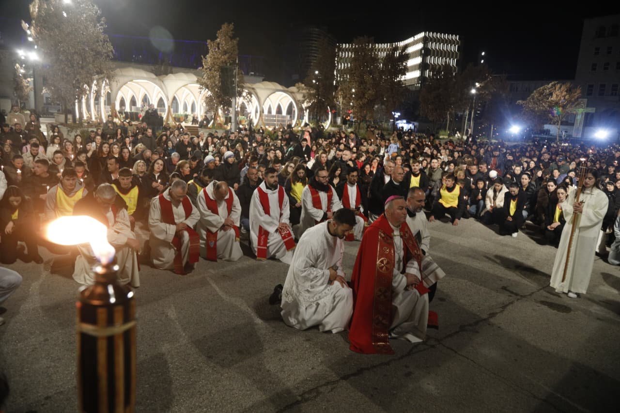 Në vigjilje të Pashkës Katolike, qindra besimtarë u mblodhën në sheshin “Nënë Tereza” në Tiranë për të kremtuar një nga ritet më domethënëse të besimit të krishterë, “Udhën e Kryqit”.