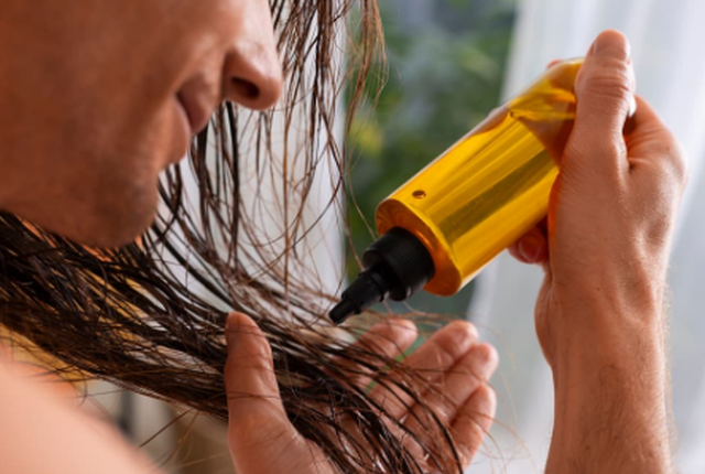 Ngrohni disa pika vaj në pëllëmbë dhe aplikojeni në skalp dhe në flokë të thatë.