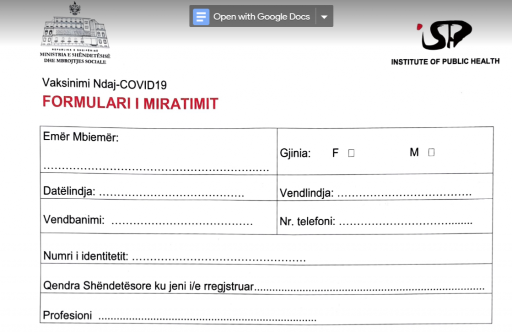 Në formularin e miratuar nga Ministria e Shëndetësisë mungon përcaktimi i sektorit publik ose privat, ku punon personi që vaksionohet, ndonëse kërkohet profesioni.