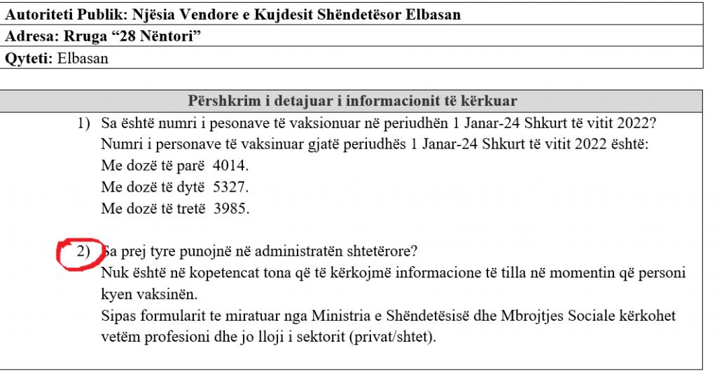 Fillimisht i dërguam një kërkesë për informacion Njësisë Vendore të Kujdesit Shëndetësor Elbasan, e cila mohoi të ishte përgjegjëse për shënimin e profesionit të pacientëve gjatë vaksinimit të tyre.