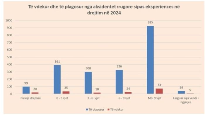 Për grup-moshat me 3–6 vjet përvojë drejtimi, shifrat janë disi më të stabilizuara, nga 236 të plagosur në 2023, në 300 në 2024, ndërsa viktimat ranë nga 25 në 18. Në të njëjtën kohë, drejtuesit me 6–9 vjet përvojë drejtimi shkaktuan 326 të plagosur në 2024, një rritje krahasuar me 277 në 2023, por me një ulje të viktimave nga 34 në 24.
