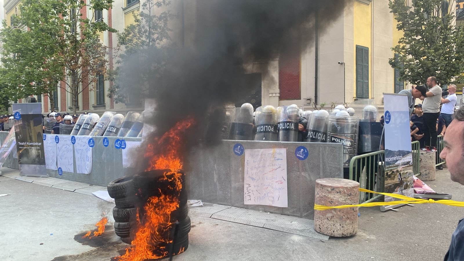 Por situata është tensionuar. Protestuesit vendosën para bashkisë disa goma të vjetra të cilat më pas iu kanë vënë flakën.
