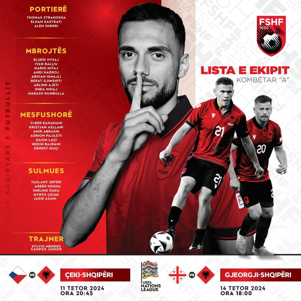 Kombëtarja shqiptare do të luajë dy ndeshjet e radhës në UEFA Nations League, ndaj Çekisë (11 tetor, “Epet Arena”, 20:45) dhe Gjeorgjisë (14 tetor, “Mikheil Meskhi Stadium”, 20:45).