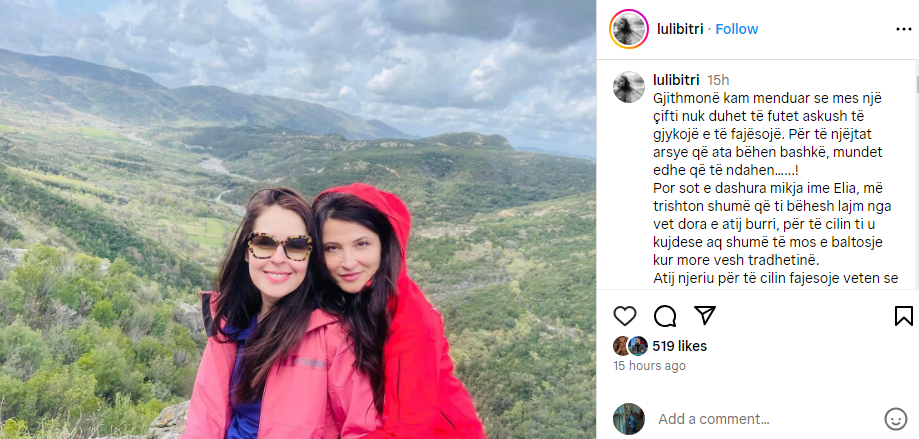 “Gjithmonë kam menduar se mes një çifti nuk duhet të futet askush të gjykojë e të fajësojë. Për të njëjtat arsye që ata bëhen bashkë, mundet edhe që të ndahen……! Por sot e dashura mikja ime Elia, më trishton shumë që ti bëhesh lajm nga vet dora e atij burri, për të cilin ti u kujdese aq shumë të mos e baltosje kur more vesh tradhtinë. Atij njeriu për të cilin fajësoje veten se mos nuk ke bërë mjaftueshëm për ta bërë të lumtur… që u shty drejt një tjetre. Atij njeriu për të cilin u ndjeve sikur të kishte vdekur një pjesëtar i familjes kur ai i mungonte netëve kur vajza jote e kërkonte mes ngashërimash..! Unë nuk kam takuar një grua me këtë tolerancë dhe force për ta edukuar veten me faljen dhe jo me urrejtjen….! Kemi qenë shumë afër këto kohë dhe kam njohur fisnikërinë tënde për të falur sepse për ty ai është babai i vajzës dhe se nuk ja dëshiron kurrë asgjë të keqe! Sepse ti je bija e një babai të plagosur e të zhgënjyer e megjithatë ai të emocionon kur e sheh rrugëve të Tiranës duke iu dedikuar mbesës…! Atij babai- gjyshi qe edhe pse duhet te jetë betuar se nuk do të shkelte më në atë shtëpi, në emër të dashurisë, ka qëndruar pa gjumë me ty dhe me të voglën, ( në vend të të atit) gjithë këto netët e ditët e kësaj javë, kur ti digjeshe nga temperatura në shtëpi…! Duke ditur gjithë këto dhe duke të njohur mirë, unë të dërgojë një përqafim ty dhe babait tënd, për të cilin ti je krenare! Për babain tim do e ktheja botën përmbys! Mjerë kush nuk do i bëjë fëmijët e vet krenarë”, shkruan Luli Bitri.